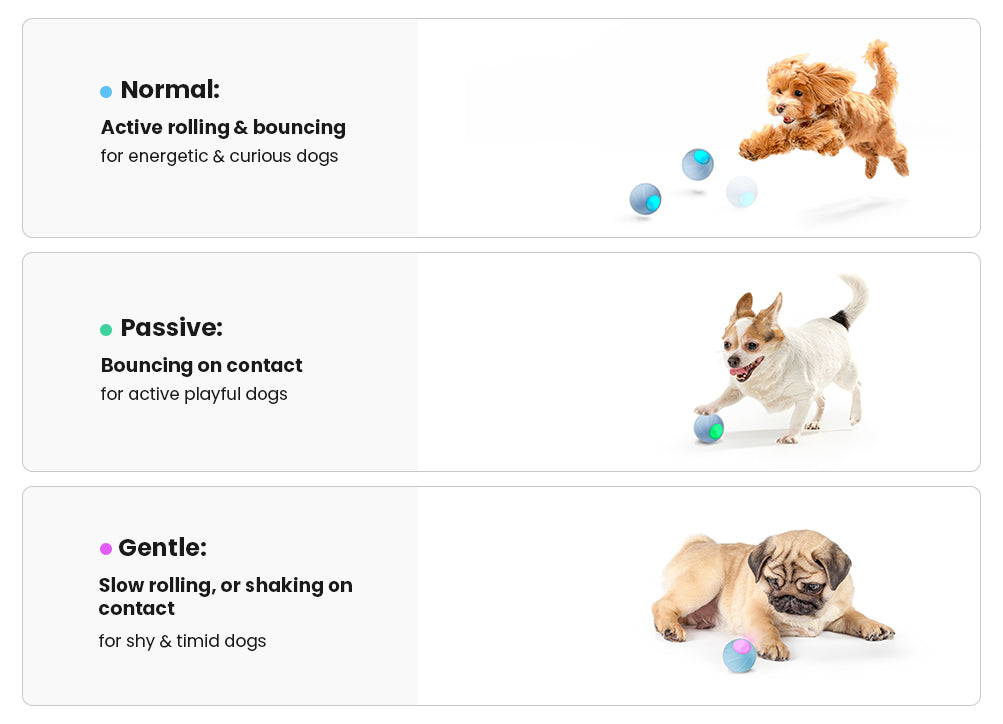 Explore 3 interactive modes depending on your dog’s mood, from high-impact chases to chilled Sunday rollin’.